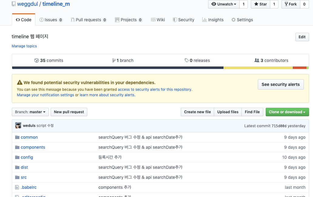 github에서 개인적으로 하고 있는 토이프로젝트 wedul_timeline을 친구와 함께 작업하기로 해서 그룹을 생성했다.