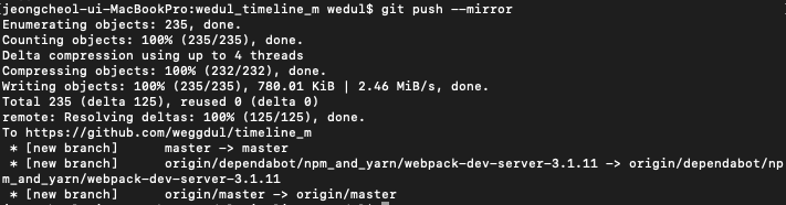 결과를 확인해보면 레포지토리가 히스토리까지 그대로 옮겨진 것을 확인할 수 있다.