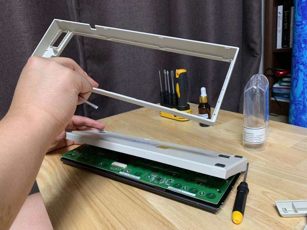 그리고 카드를 이용해서 틈새를 벌리고 겉 테두리에 플라스틱을 벗겨냈다. 플라스틱을 벗겨내는 과정에서 밑판에 나사 하나를 풀어줘야 했다.