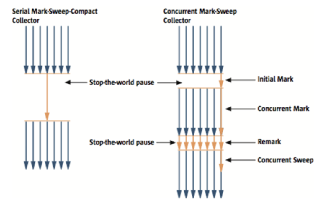 기존에 사용되던 GC 알고리즘 보다 STW pause 시간을 줄이기 위해 고안된 방법으로 없애야 하는 데이터를 정확하게 선별하는 작업이 추가로 진행된다. 그만큼 연산작업이 추가되어 CPU같은 리소스 자원 사용이 증가하였다. 최초 GC 판단하는 initial Mark, initial mark때 선정된 객체를 참조 하는 객체의 GC 대상인지 판단하는 Concurrent Mark, 마지막 검증 작업을 하는 Remark작업을 통해 대상을 선정한 후 Concurrent Sweep 작업을 통해 데이터를 지운다. 그리고 기존 Serial GC와의 차이점은 데이터를 sweep한 후 compaction 작업을 자주 진행하지 않는다. 파편화된 메모리를 자주 매꾸면 그만큼 오버헤드가 많이 발생할 수 있기 때문에 심각한 파편화가 발생했을 때만 매꾼다.