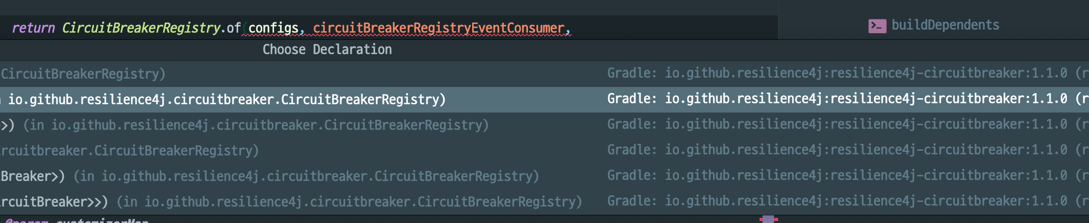 Cannot resolve method 'of(java.util.Map<java.lang.String,io.github.resilience4j.circuitbreaker.CircuitBreakerConfig>, io.github.resilience4j.core.registry.RegistryEventConsumer<io.github.resilience4j.circuitbreaker.CircuitBreaker>, io.vavr.collection.HashMap<K,V>)'