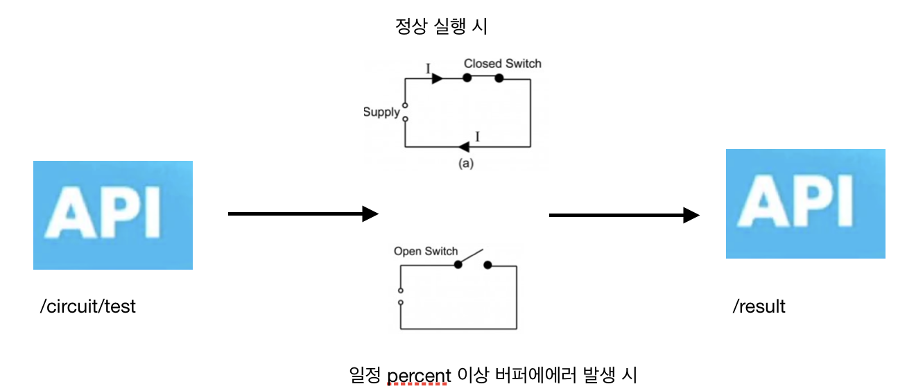 도식을 간단하게 그리면 다음과 같이 circuit/test 엔드포인트로 들어온 요청을 Circuit Breaker가 설정되어있는 webClient를 사용해서 /result api를 찔러 결과를 리턴 받는다. 이때 에러가 지정한 percent이상 ring buffer에 발생하였을 때 circuit 스위치가 열리는지 확인해보면 된다.