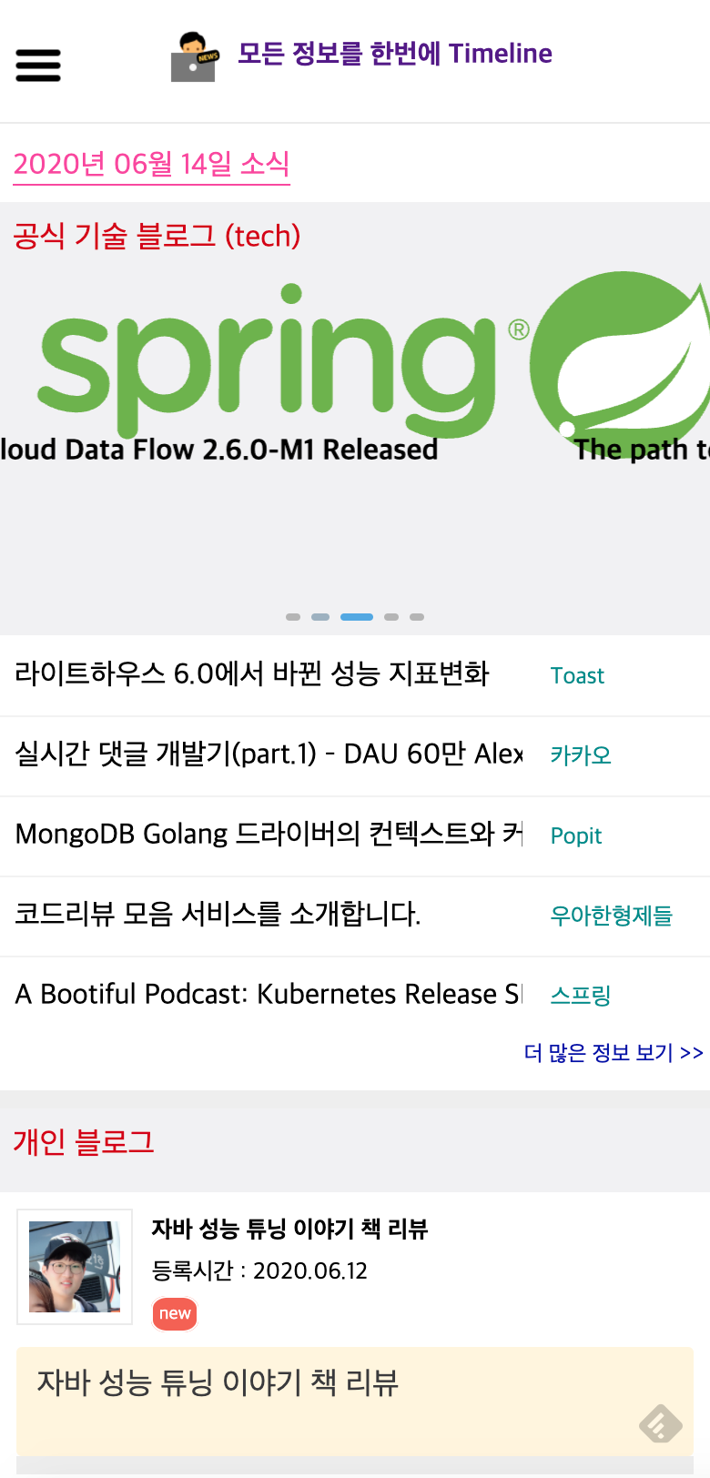 타임라인의 목적은 개발에 관련 블로그 내용들과 채용 뉴스등을 한번에 보기 위해서 만든 서비스이다.