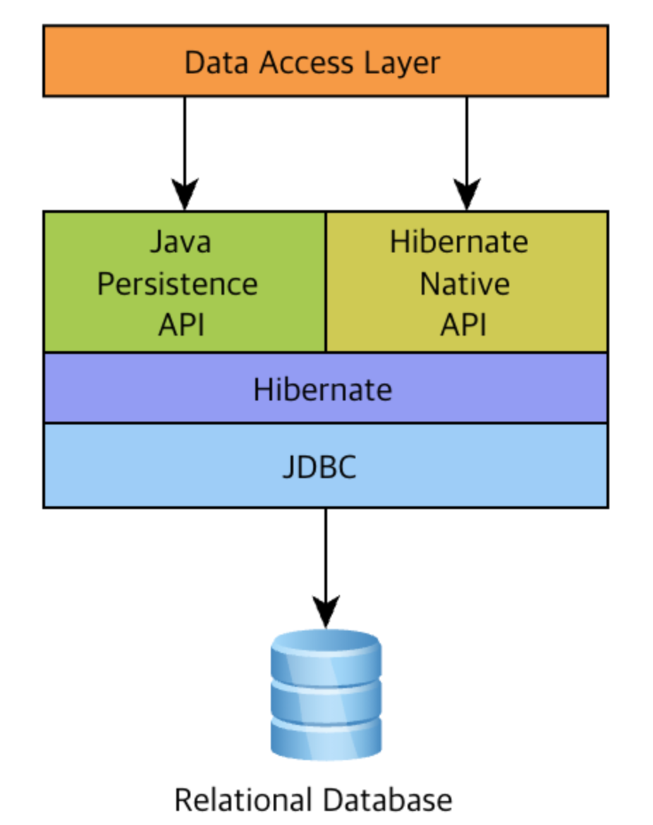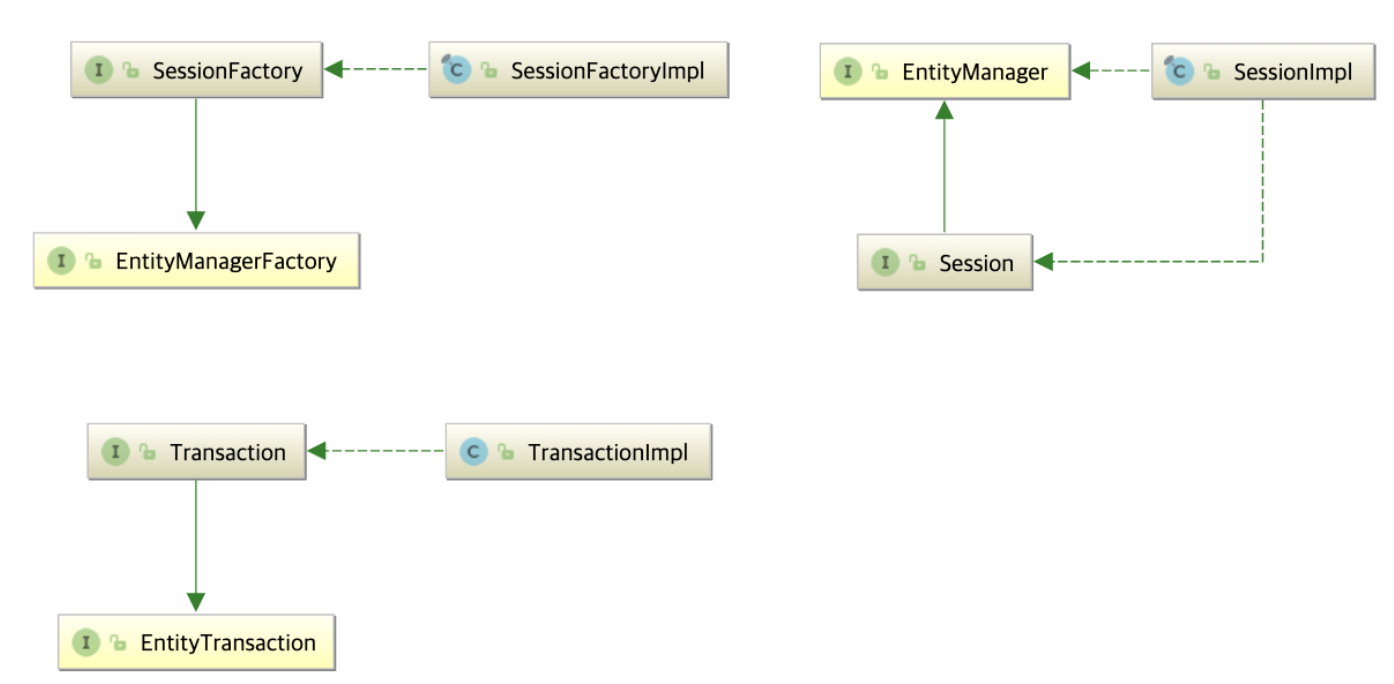 JPA provider로써 Hibernate는 Java Persistence API의 요구사항을 구현하고 JPA 인터페이스와 Hibernate 특정 구현 사이에서 아래 다이어그램을 통해 시각화할 수 있다.