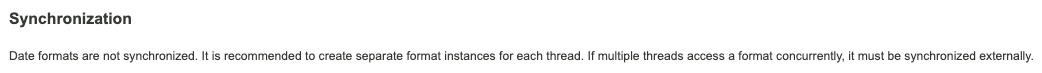 문서 내용을 확인해보면 SimpleDateFormat은 not synchronized하기 때문에 각각의 쓰레드에서 생성하라는 경고성 문구가 있었다.