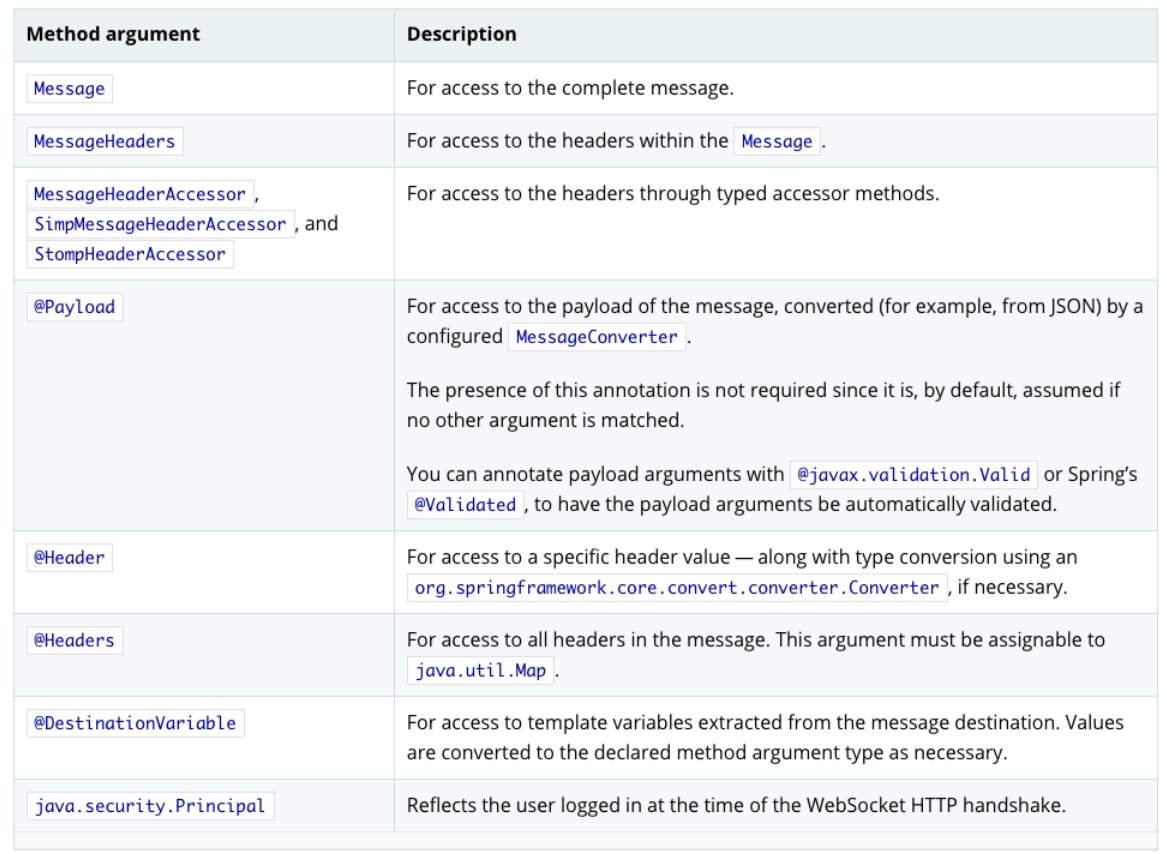 - @MessageMapping과 비슷하지만 구독 메시지를 받는데 한정된 매핑만을 지원한다. 지원하는 argument는 @MessageMapping과 동일하지만 기본적으로 메시지는 다이렉트로 client에게 전송되며 broker에게 전송하지 않는다.