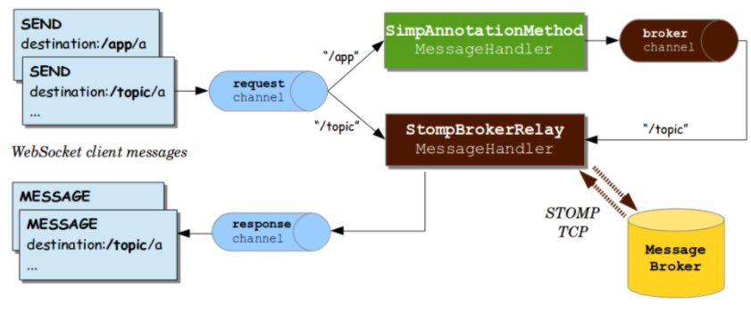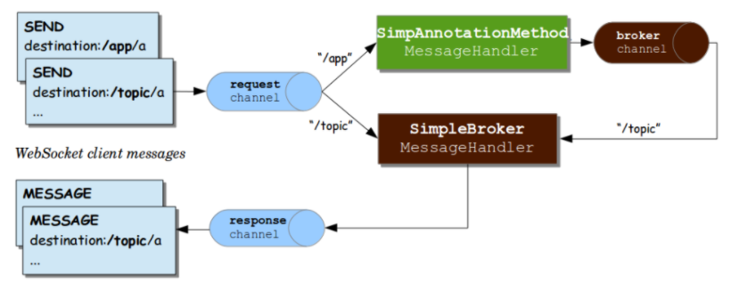 예를들어 STOMP 메시지 /app으로 시작하는 destination header를 가지고 들어오는 요청은 Controller 애노테이션 되어있는 클래스 내부에 @MessageMapping메소드가 할당곳으로 매핑되고 반면에 /topic, /queue의 요청을 가지고 들어오게 되면 바로 message broker에게 전달 된다.