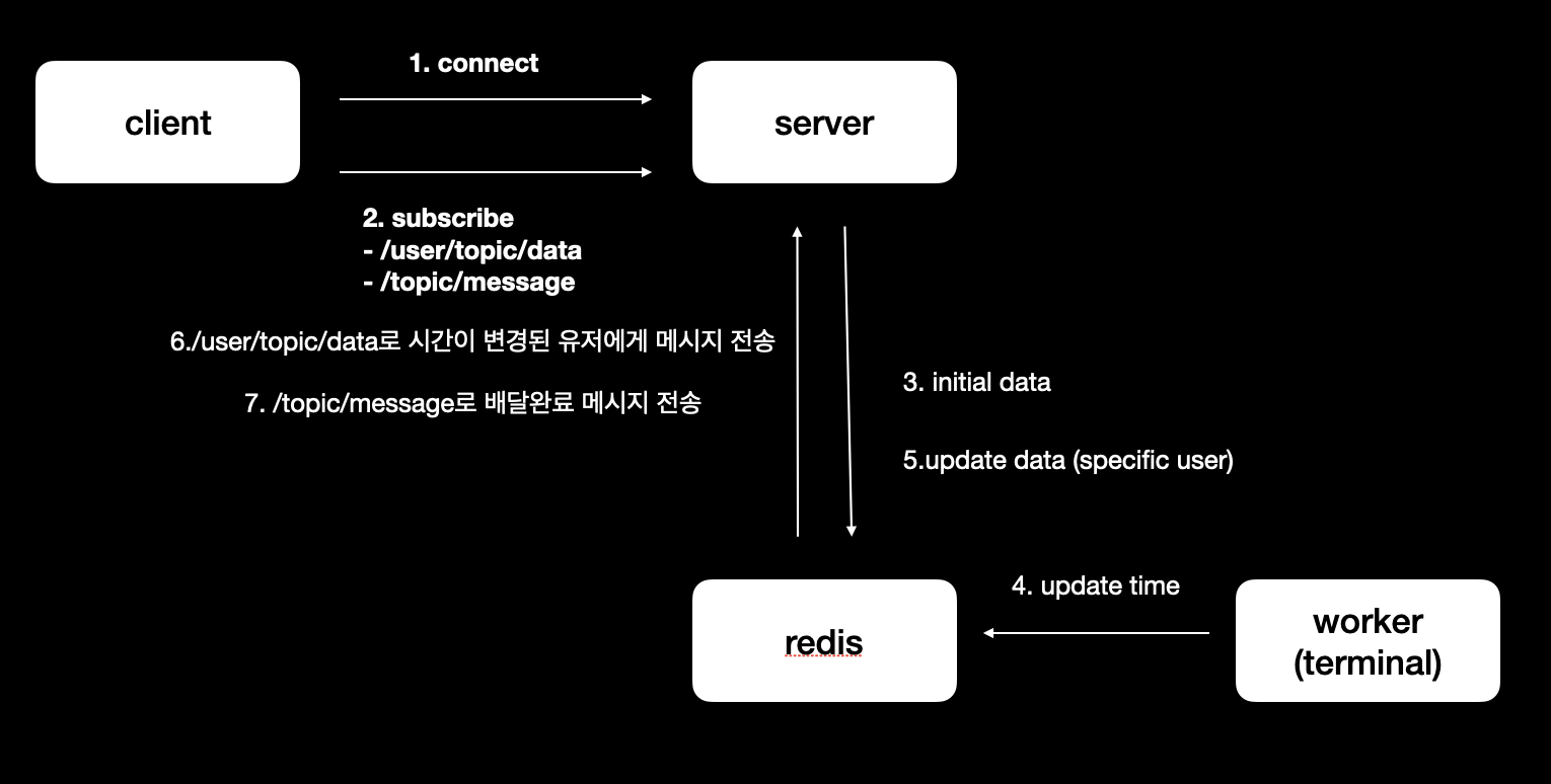 3. 초기에 connect(주문시작)되면 redis에 저장된 initial data를 전달한다. 만약 주문 시작 이후에 사용자가 다른 디바이스로 접속 시에는 initial data를 현재 진행중인 주문의 시간을 전달받는다.