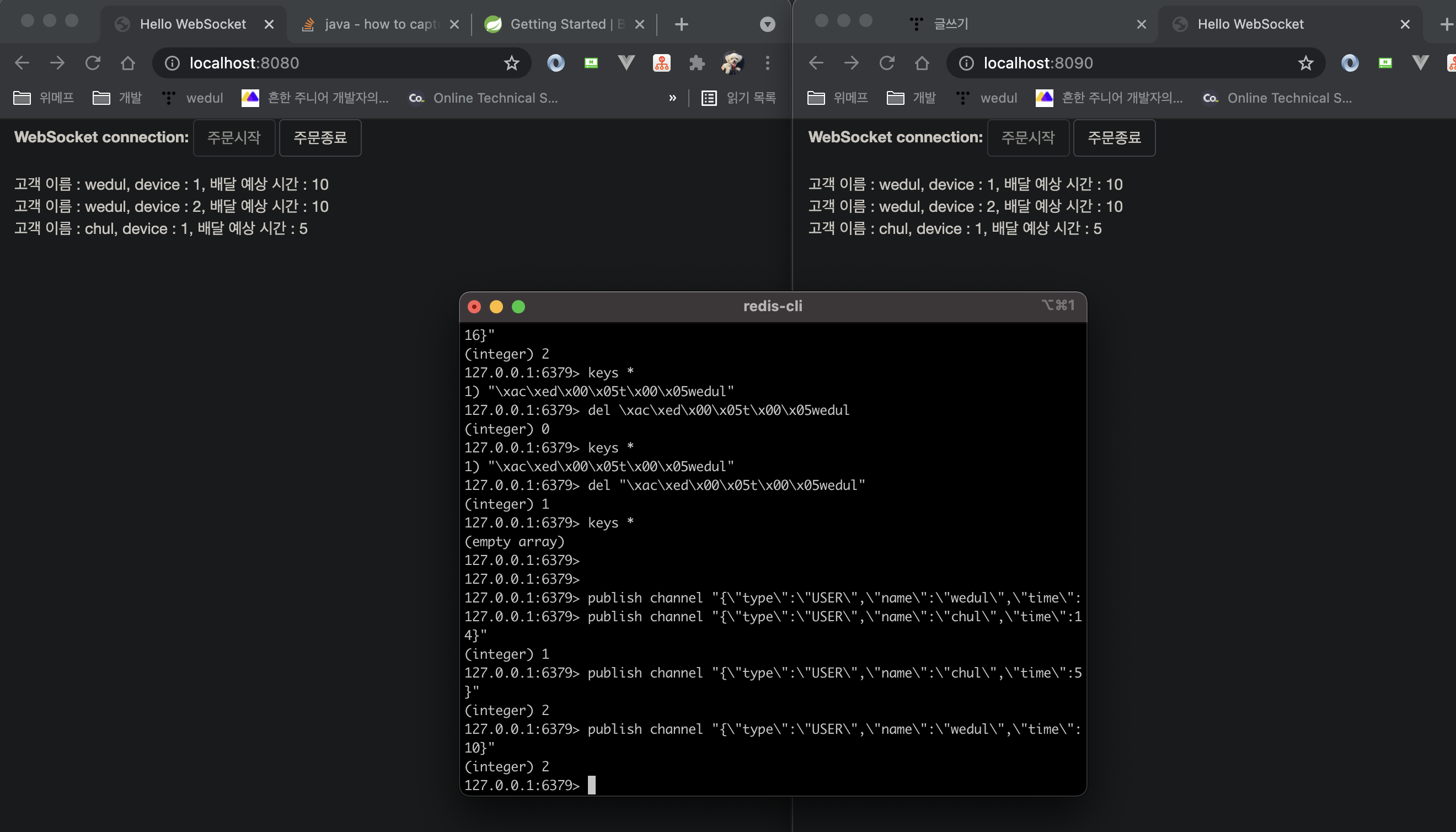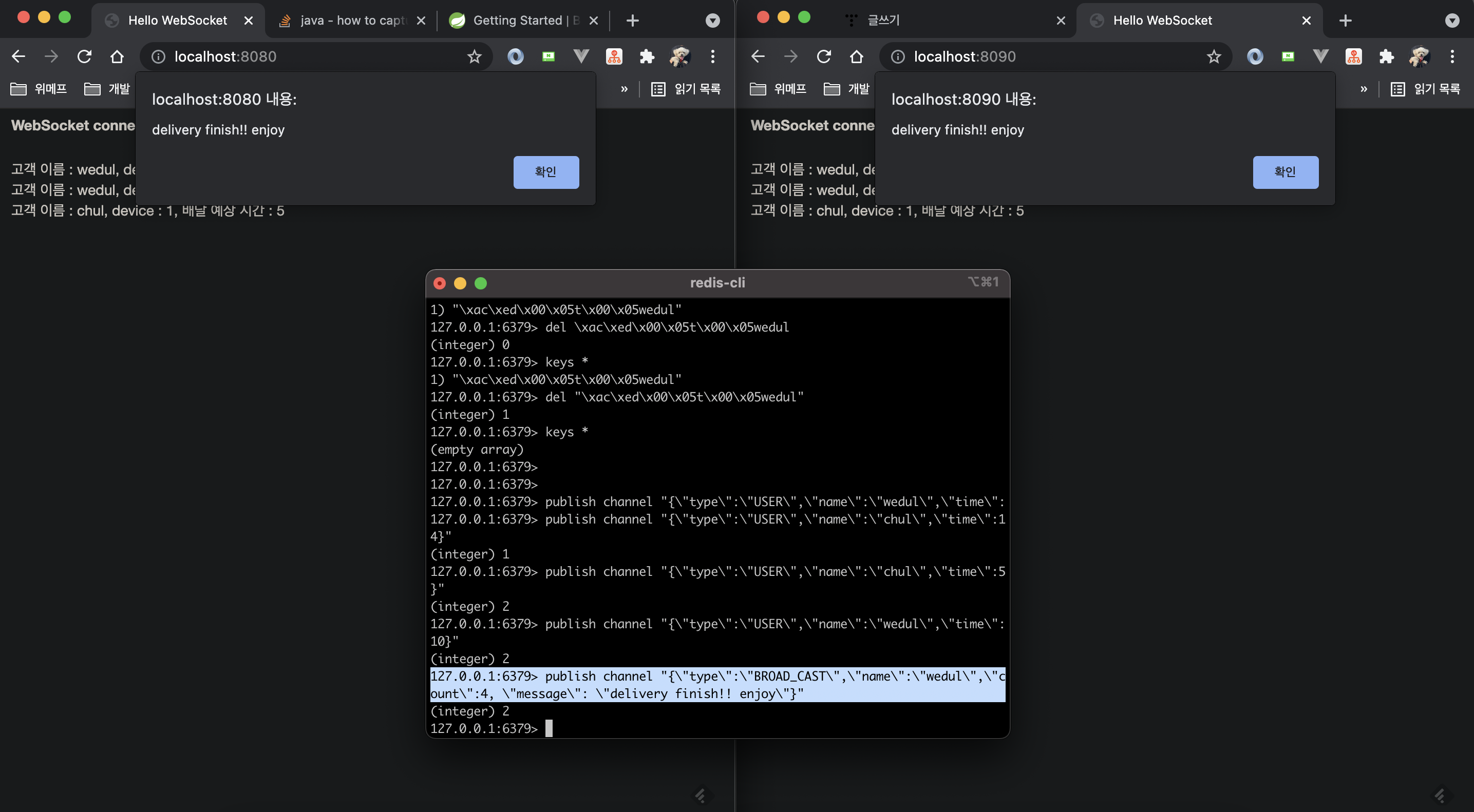 4. worker가 없어서 terminal로 redis의 channel topic에 user별 변경 된 배달 예상시간 정보를 전송한다.