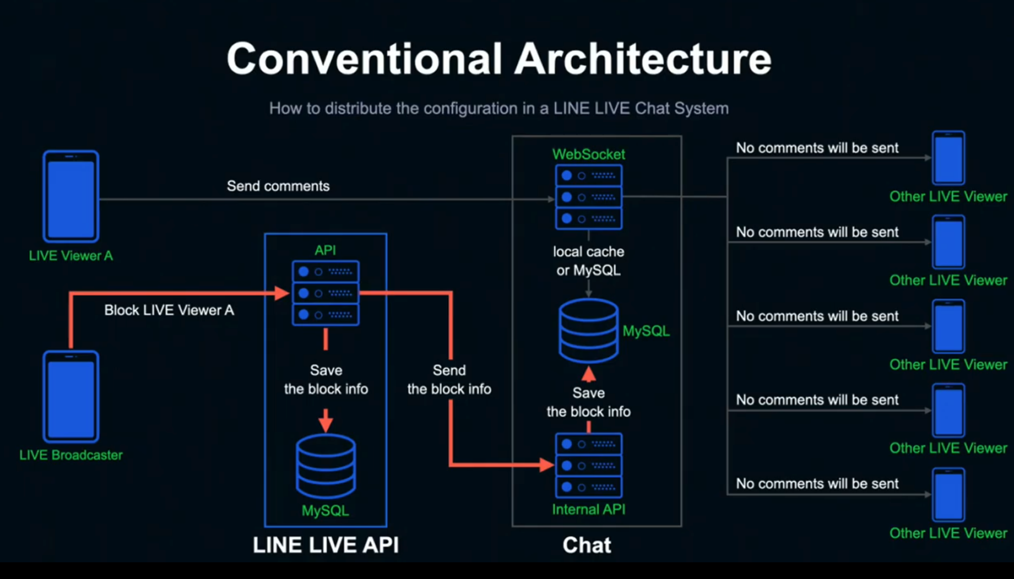 - 웹소켓은 로컬캐시를 뒤지고 없으면 mysql을 뒤져서 차단정보가 있는지 확인하고 해당 사용자의 차단정보가 있는 경우 다른 클라이언트들에게 해당 정보가 보이지 않도록 처리한다.