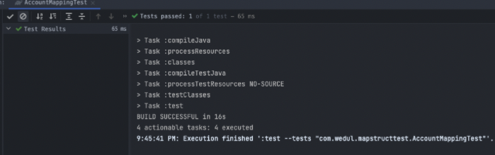나머지 코드는 위에 필드가 다른경우의 예시와 같고 Mapper 애노테이션에만 componentModel에만 spring으로 변경해줬다. 일일히 설정해주기 귀찮다면 gradle 설정 시 script에 option을 지정해줄 수 있다. 나머지 옵션들도 문서에서 확인해볼 수 있다. (https://mapstruct.org/documentation/dev/reference/html/#configuration-options)