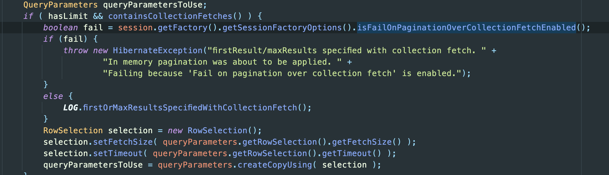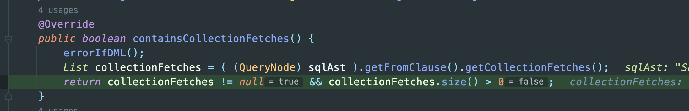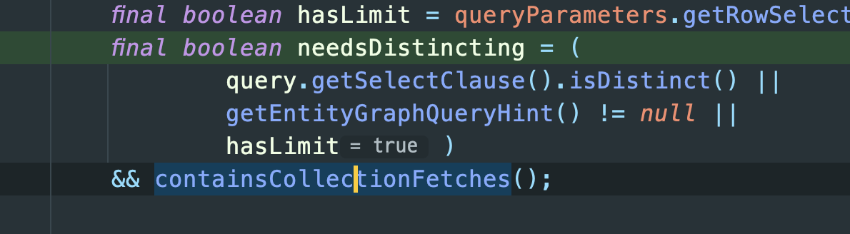 그 이유는 쿼리를 실행하고 결과를 가져오는 hibernate 코드를 살펴보면 알수있다. QueryTranslatorImpl에 보면 limit이 주어진 쿼리인지 보고 주어진 쿼리일 경우면서 collectionFetches 쿼리일경우에 아래처럼 distinct가 필요한 쿼리로서 판단하게 된다.