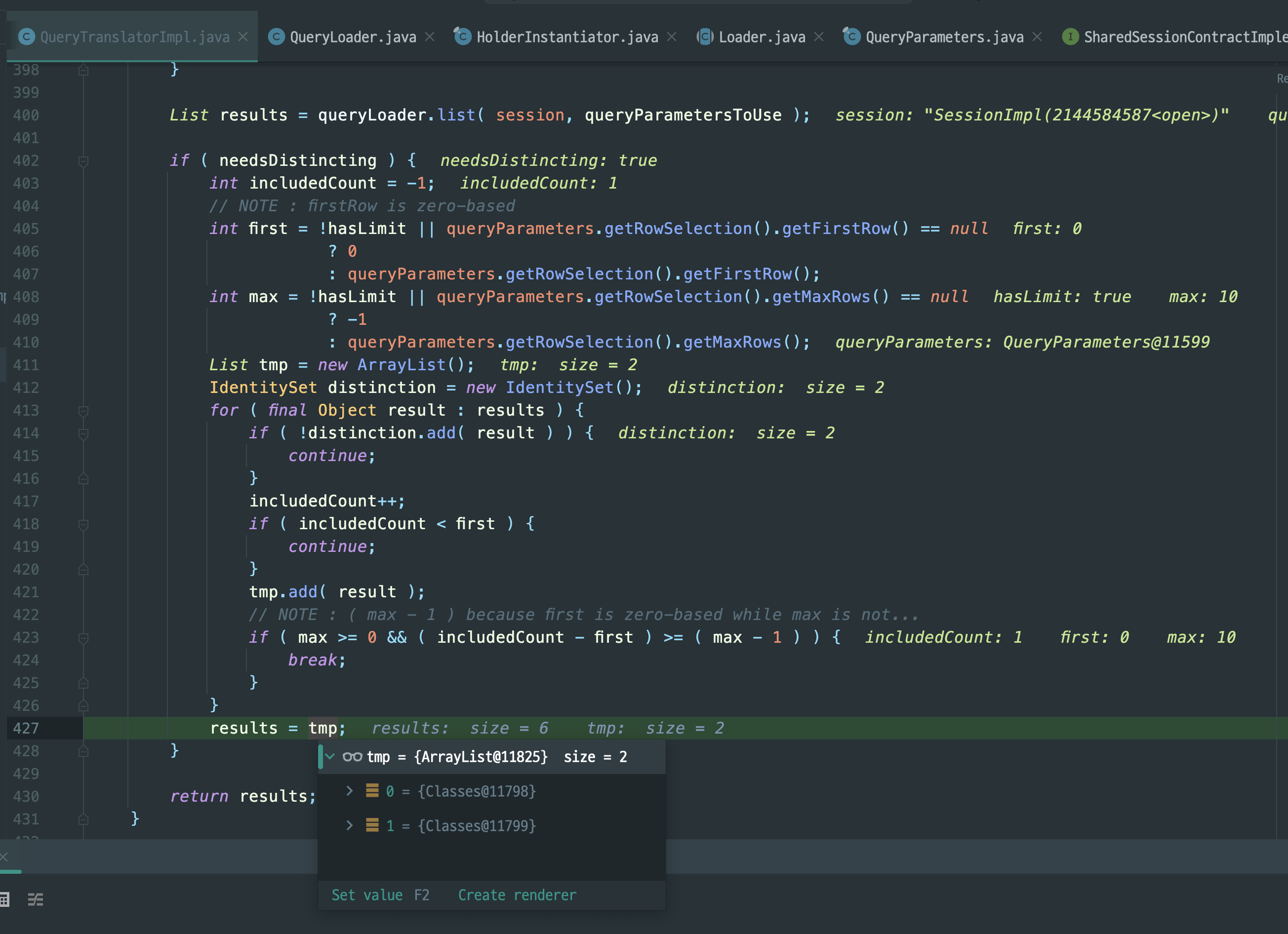 하지만 그 다음 가져온 queryResultList를 가지고 최종 값을 산출하기 위한 QueryTranslatorImpl에서 needDistincting일 경우 IdentitySet을 사용해서 유일한 Classes의 값을 가지고 올수있도록 하고 있다.