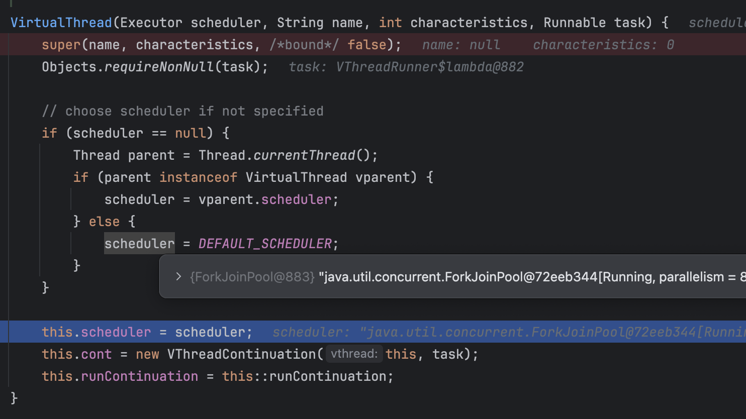 내부적으로 실행되는 로직을 확인해보자. openjdk에 있는 테스트용 VThreadRunner.java 코드를 이용해서 호출해보면서 내부적으로 VThread에서 사용되는 carrier thread 호출 scheduler는 fork join pool을 사용하는 걸 알 수 있다.
