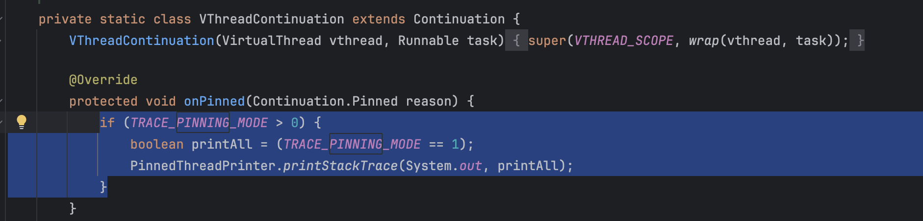 pinning 이 발생해서 VT 생성시에 추가되었던 VThreadContinuation에 onPinned가 실행된다.