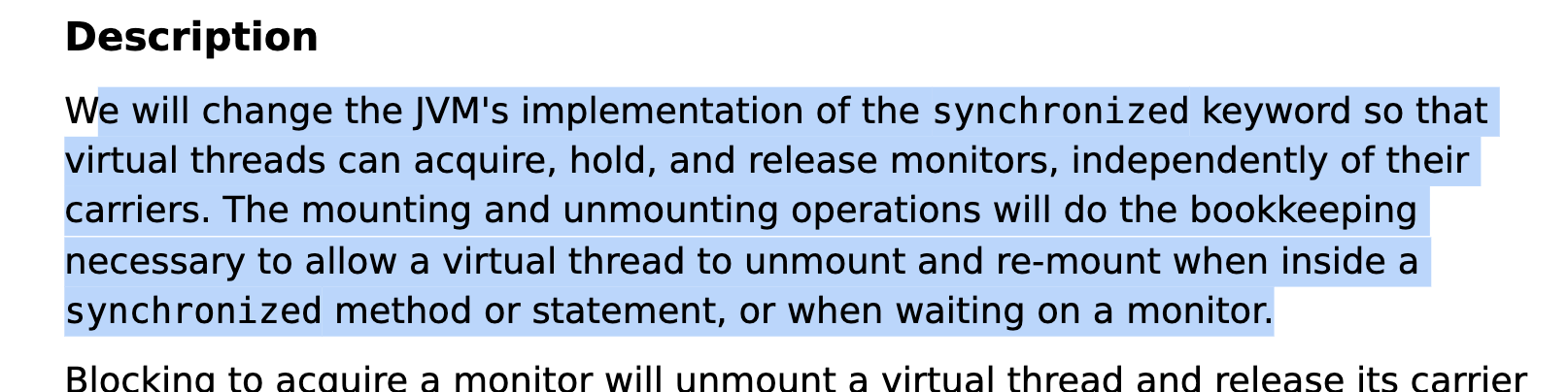 openjdk에 올라온 내용을 보면 jdk24부터는 synchroize를 사용하더라도 pinning이 되지 않도록 수정했다고 하는데 그 주요 내용은 carrier thread가 synchorinzed를 만났을 때 monitor를 점유하는게 아닌 vt가 점유하게 하고 그 vt를 unmount시키도록 하는 방법이다.