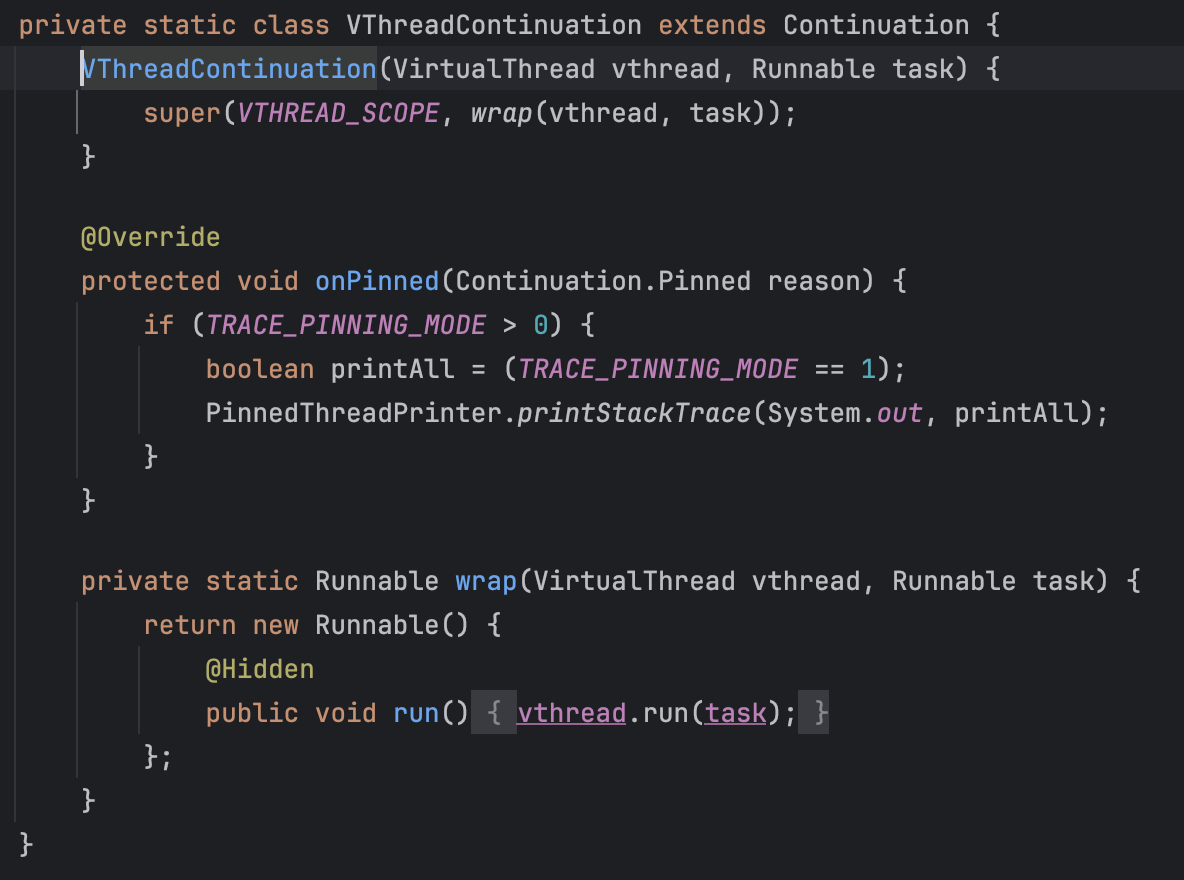 그리고 contiton을 생성해서 task를 실행시키는데 이때 사용되는 VThreadContinuation을 생성한다. 이 Continuation은 실제 해당 vt가 실행될 때 호출되는 메소드이고 wrap이외에 onPinned가 구현되어 있는데 onPinned는 내부적으로 vt가 pinning되었을 때 실행되는 메소드이다.