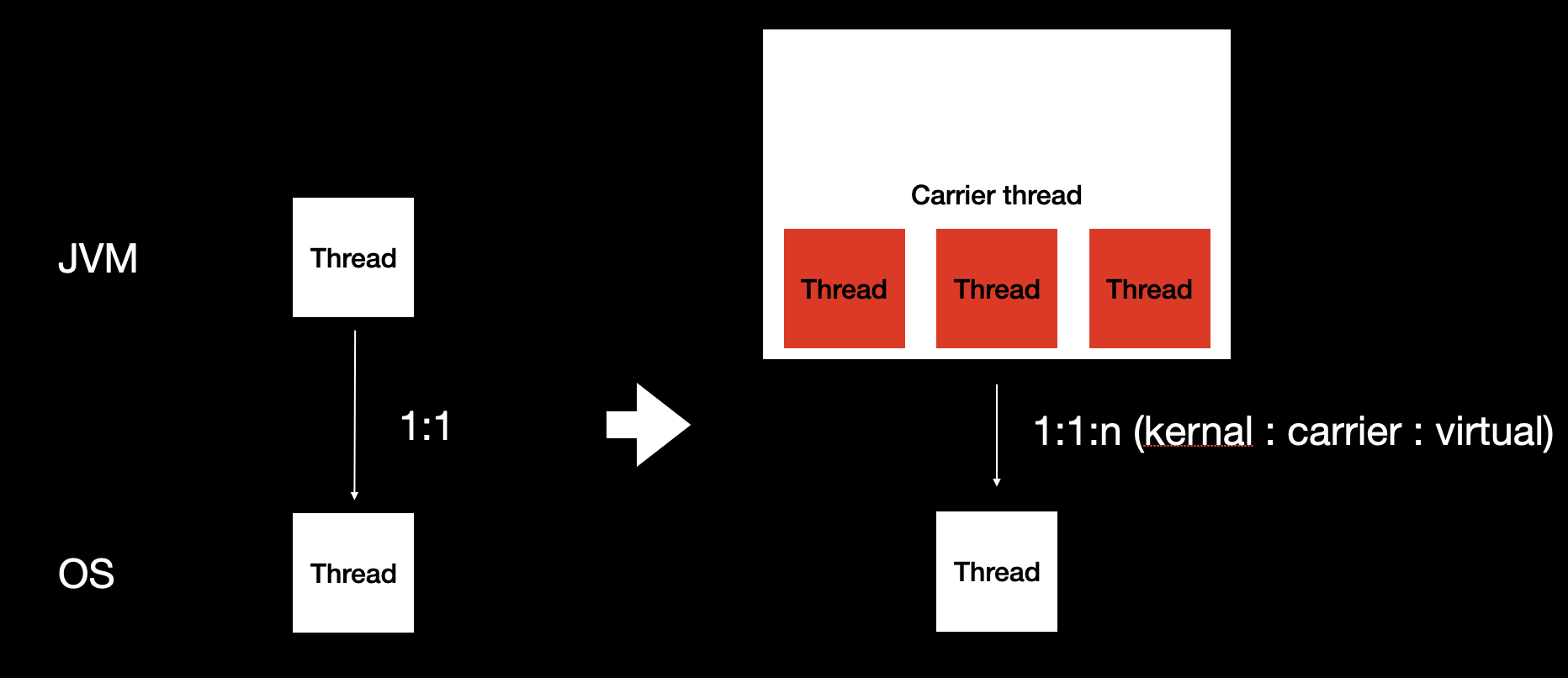 java 21부터 virtual thread가 나온 것은 대부분의 알고 있는 사실이다. 간단하게 virtual thread는 기존 jvm에 사용하는 thread가 os kernal thread에 매핑되어 사용되던 걸 carrier thread (platform thread)에 virtual thread(향후 vt)를 사용하여 내부적 요청에 vt를 carrier thead에 mount, unmont하여 kernal os를 덜 사용하는 전략을 사용하는 thread를 말한다.